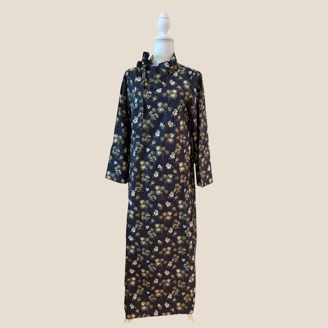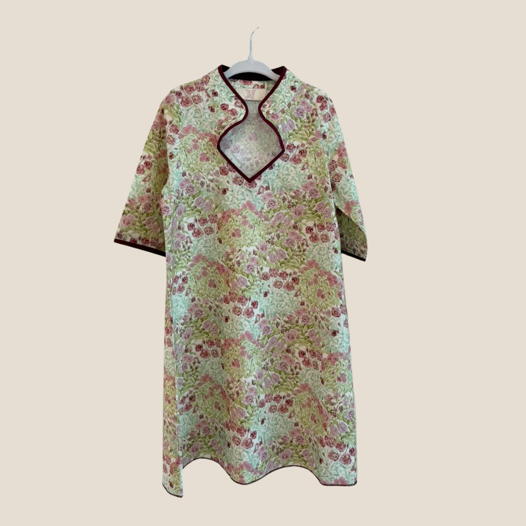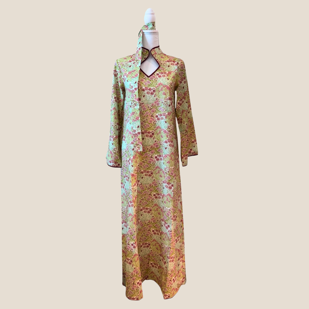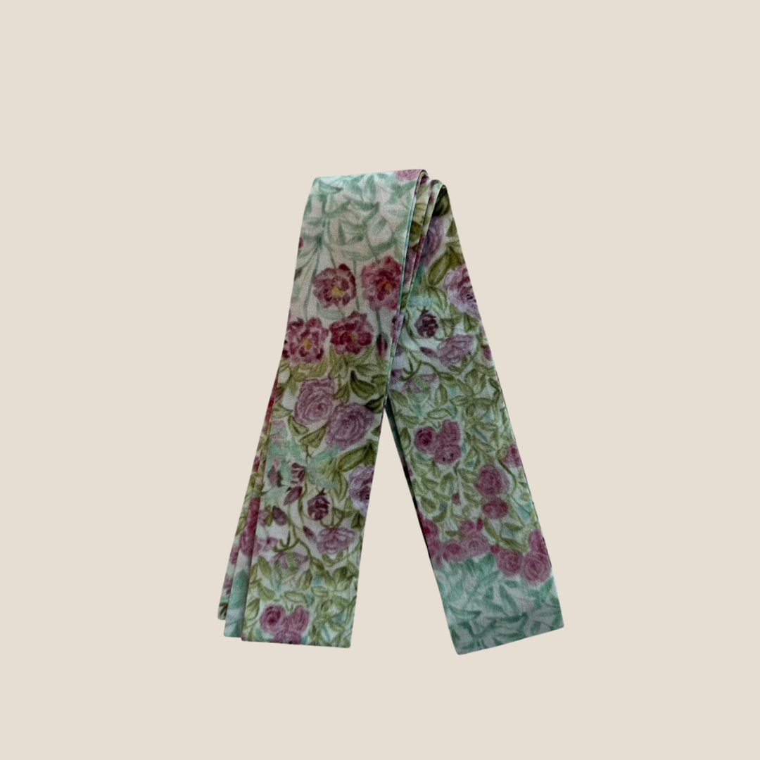 All-over floral pattern in shades of dusty rose and sage green.
