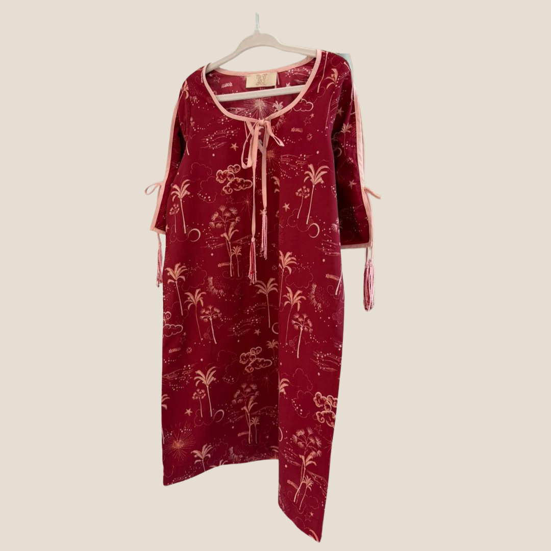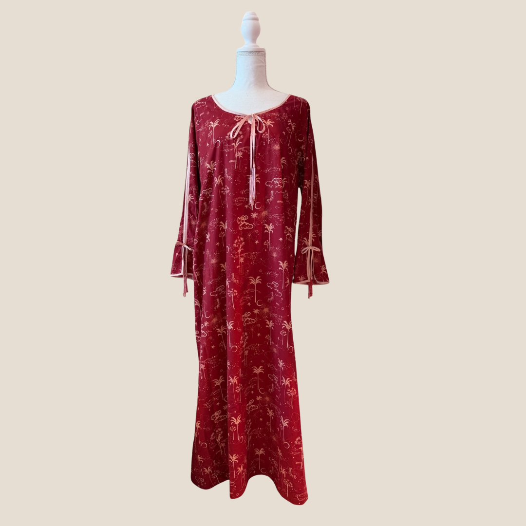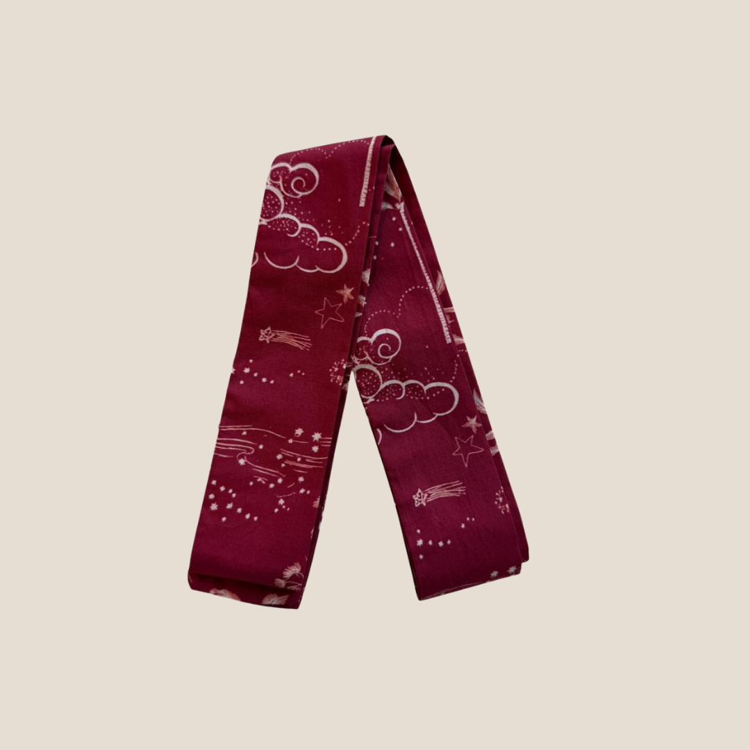Soft red fabric with moon and star print for Ramadan.